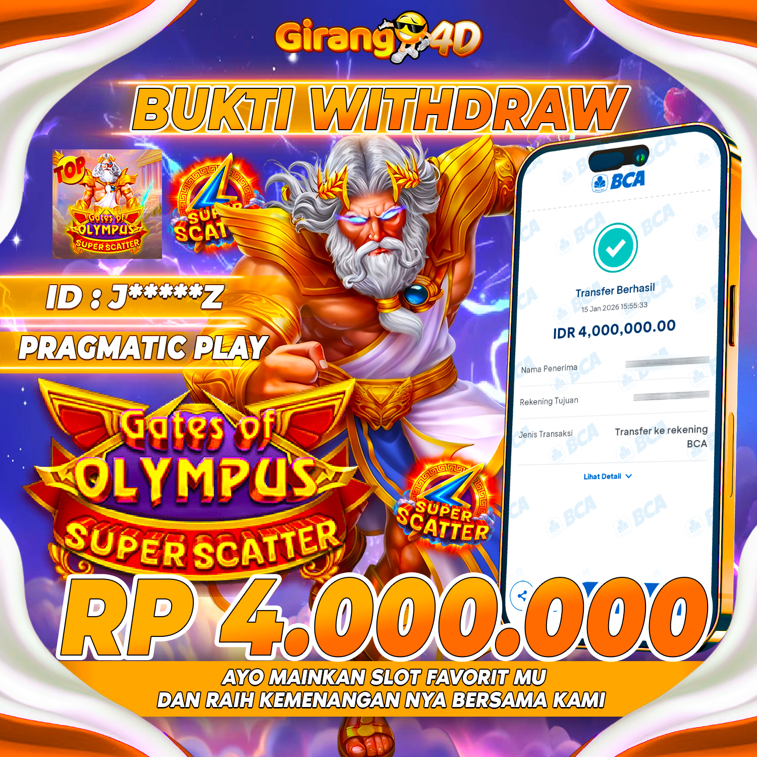 GIRANG4D Bukti Kemenangan SLOT GATES OF OLYMPUS SUPER SCATTER Selamat Kepada Id : J****Z Atas Withdraw Rp. 4.000.000 Hari ini. Ditunggu Withdraw Selanjutnya dan ajak juga teman temannya bergabung di…