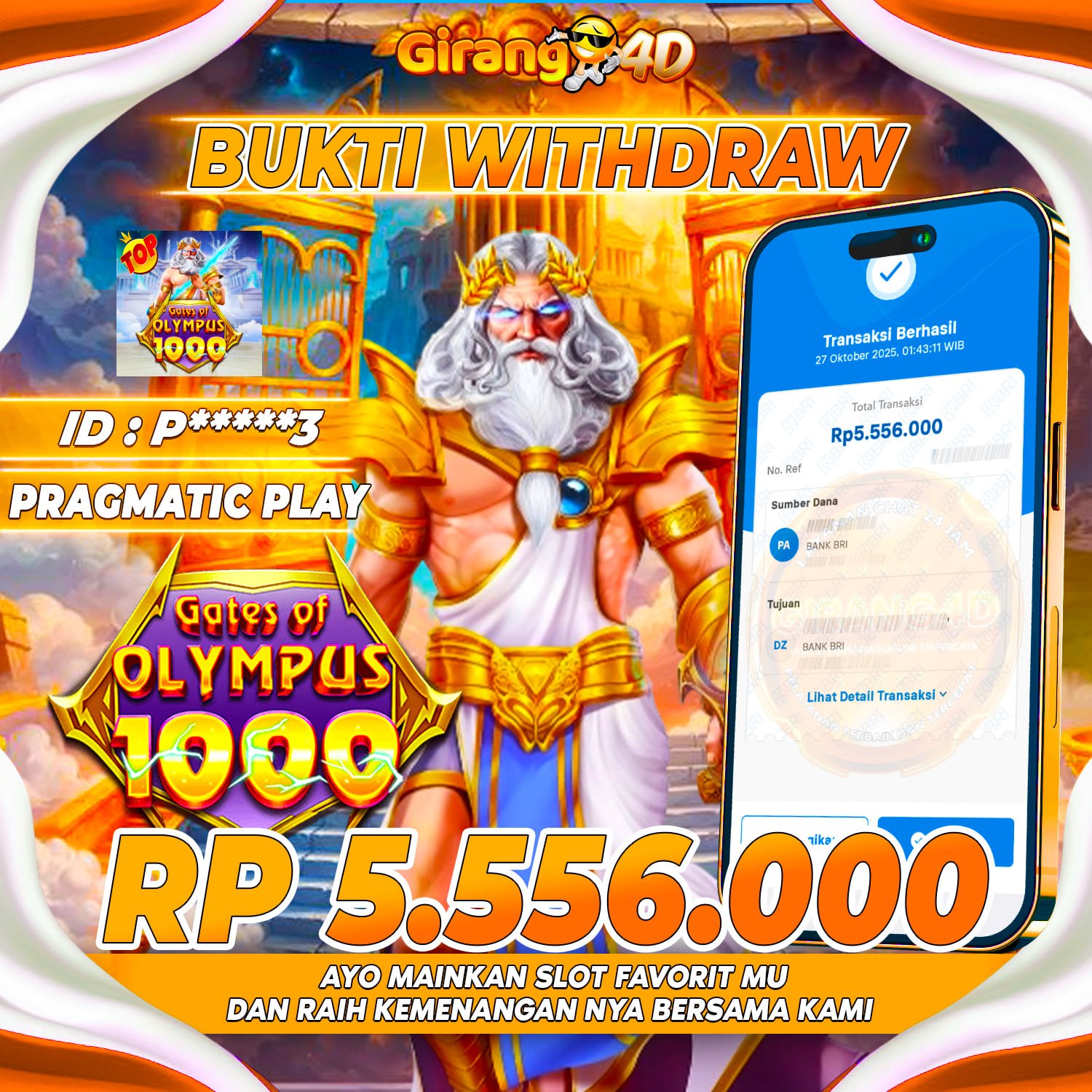 Selamat Kepada Id : P******3 Atas Withdraw Rp. 5.556.000 Juta Hari ini. Ditunggu Withdraw Selanjutnya dan ajak juga teman temannya bergabung di GIRANG4D