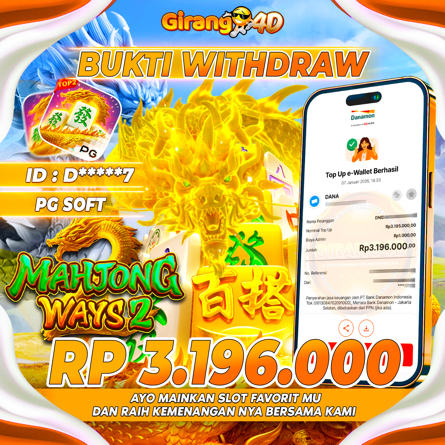 Selamat Kepada Id : D*****7 Atas Withdraw Rp. 3.196.000 Juta Hari ini. Ditunggu Withdraw Selanjutnya dan ajak juga teman temannya bergabung di GIRANG4D