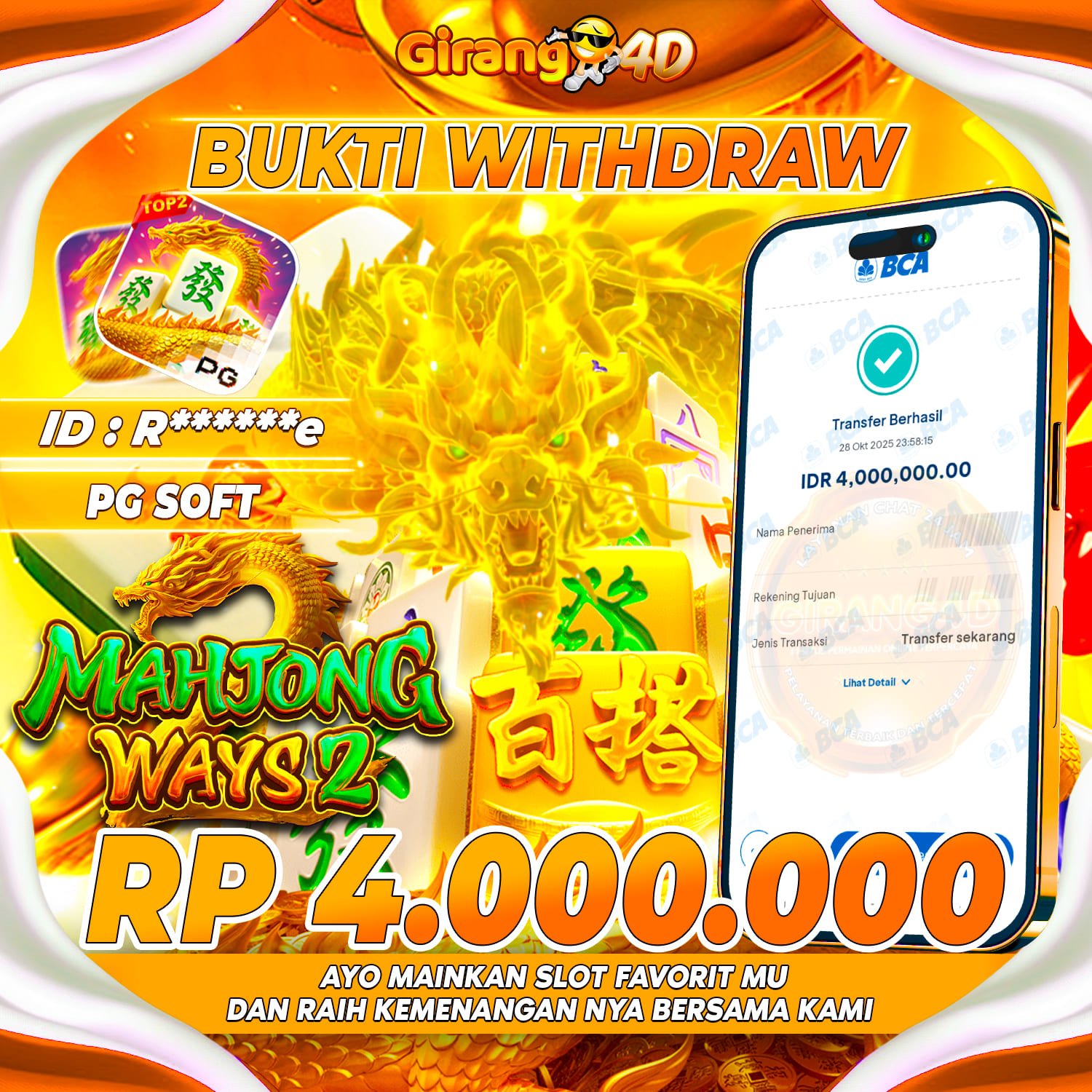 Selamat Kepada Id : R*******e Atas Withdraw Rp. 4.000.000 Juta Hari ini. Ditunggu Withdraw Selanjutnya dan ajak juga teman temannya bergabung di GIRANG4D
