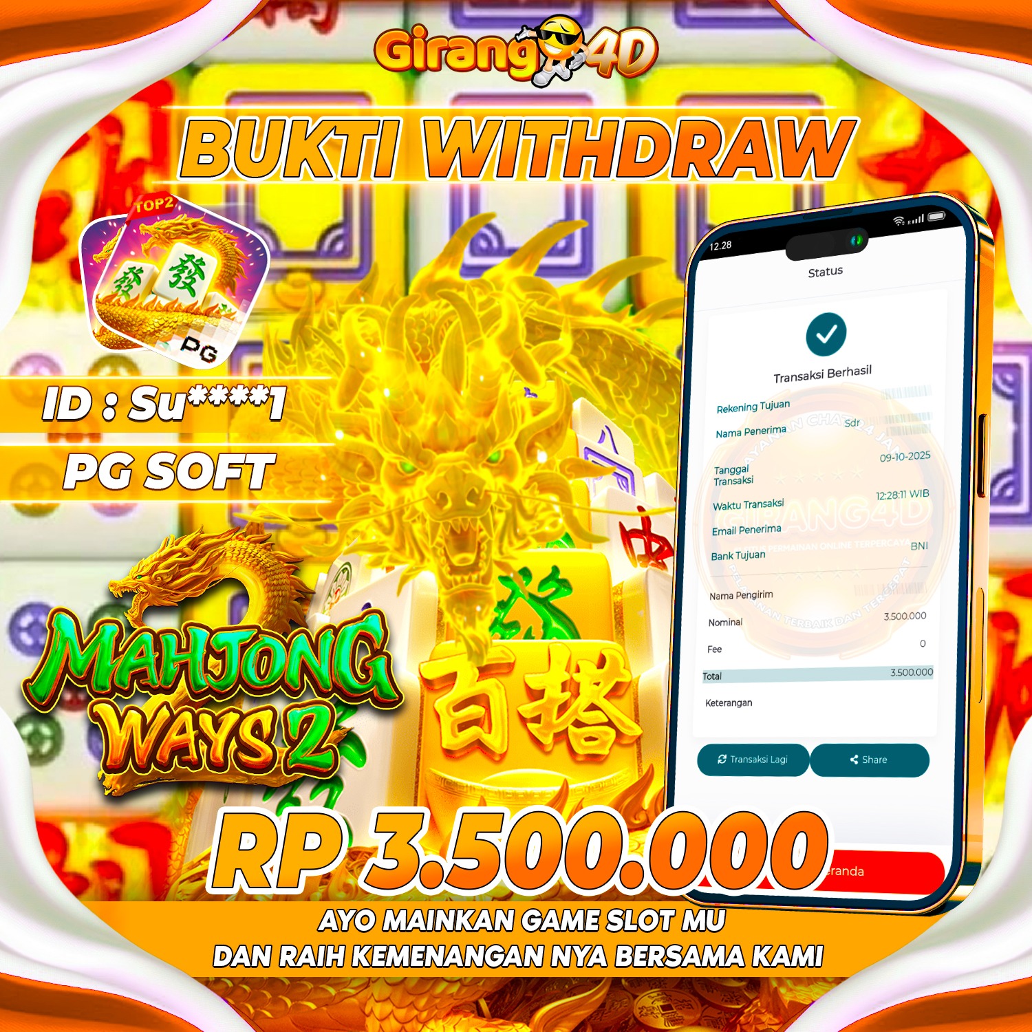 Selamat Kepada Id : Su****1 Atas Withdraw Rp. 3.500.000 Juta Hari ini. Ditunggu Withdraw Selanjutnya dan ajak juga teman temannya bergabung di GIRANG4D