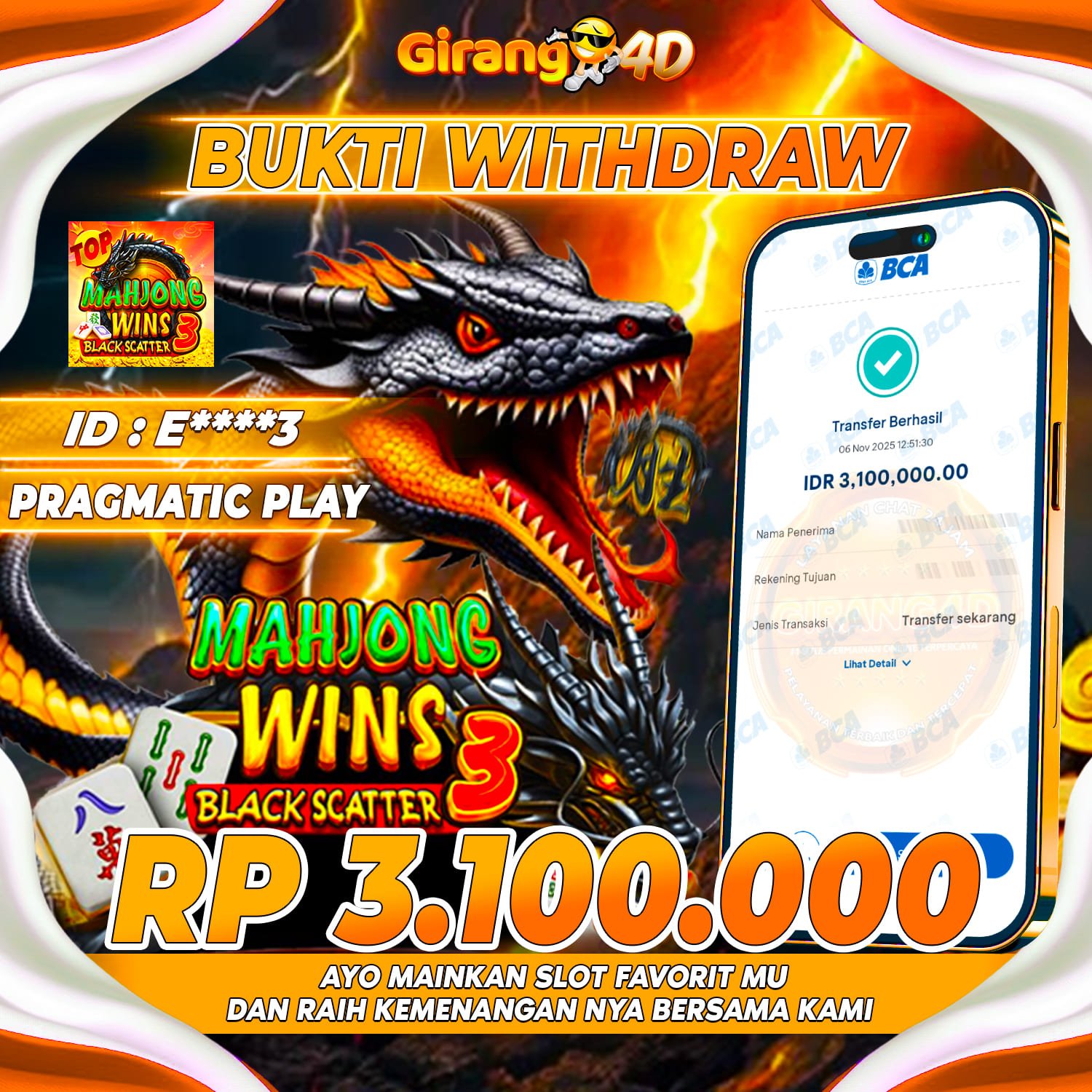 Selamat Kepada Id : E*****3 Atas Withdraw Rp. 3.100.000 Juta Hari ini. Ditunggu Withdraw Selanjutnya dan ajak juga teman temannya bergabung di GIRANG4D