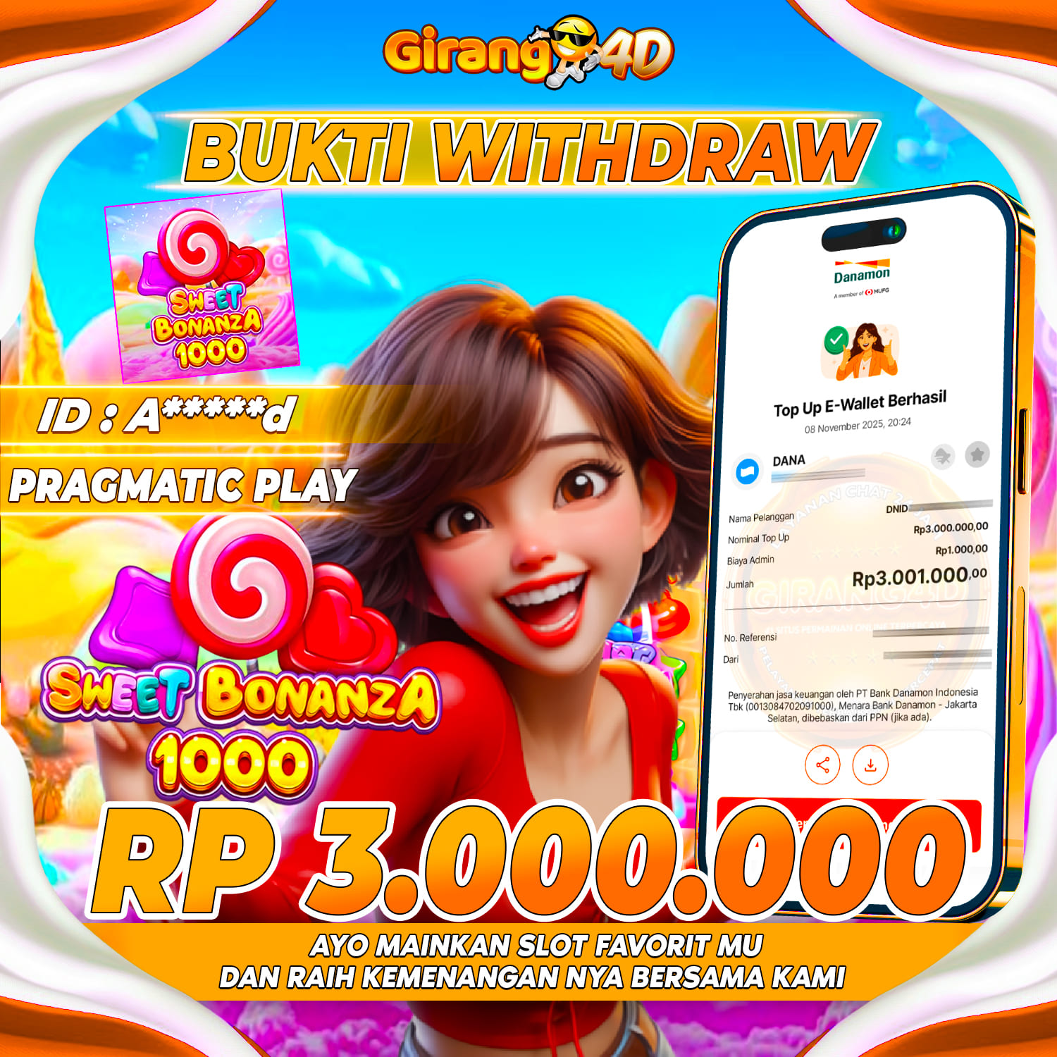 Selamat Kepada Id : A*****d Atas Withdraw Rp. 3.000.000 Juta Hari ini. Ditunggu Withdraw Selanjutnya dan ajak juga teman temannya bergabung di GIRANG4D