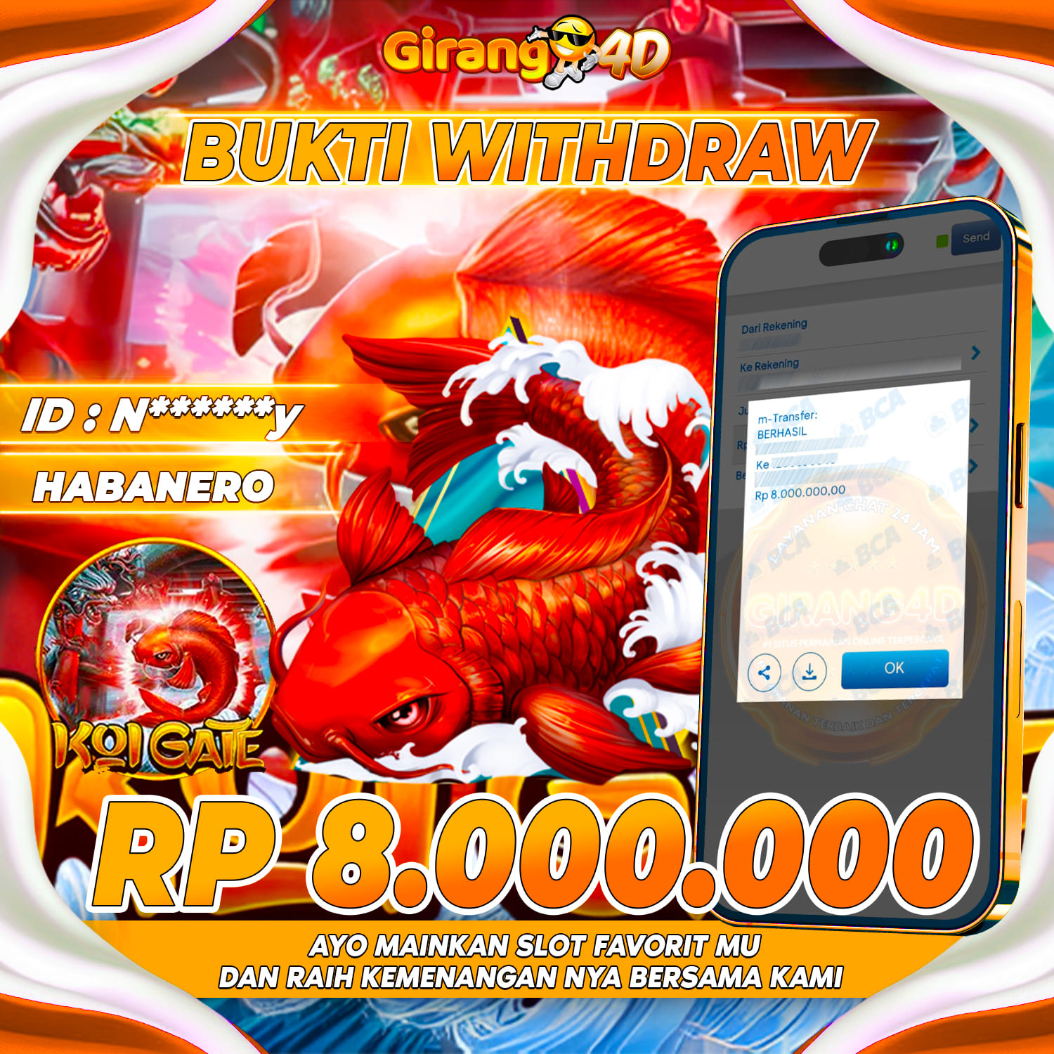Selamat Kepada Id : N*****Y Atas Withdraw Rp. 8.000.000 Juta Hari ini. Ditunggu Withdraw Selanjutnya dan ajak juga teman temannya bergabung di GIRANG4D